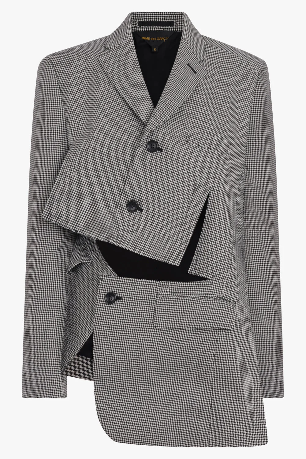A striking expression of COMME DES GARCONS’ avant-garde sensibility, the Asymmetric Deconstruct Houndstooth Jacket in Black/Ecru reimagines classic tailoring through a conceptual lens. Crafted from wool with a smooth cupro lining, this jacket takes the form of a deconstructed blazer, defined by its asymmetric cut and fractured proportions. Bold yet considered, it reflects the house’s distinctive approach to challenging traditional tailoring. - Fabrication: - 100% wool - Lining: - 100% cupro - Classic black/ecru houndstooth pattern - Deconstructed blazer silhouette with asymmetric construction - Architectural tailoring that challenges traditional proportions - Smooth cupro lining for comfort and fluid wear - Conceptual design balancing structure with intentional irregularity Style it with tailored trousers or contrast it with relaxed denim for an effortlessly contemporary look. Size and Fit Tiah: Model is 178cm/5’9” and is wearing a size S Model Measurements: Bust: 86cm, Waist: 69cm, Hips 90.5cm Form fitting, stretchy material. Recommended to take usual size.
