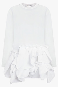 A playful twist on a wardrobe staple, the COMME DES GARCONS Crew Neck L/S Top with Exaggerated Ruffle Hem in White elevates a classic silhouette with distinctive detailing. Crafted from 100% polyester, this long-sleeve top features a bold ruffle hem that adds volume and movement, transforming a simple crew neck into a standout piece. - Fabrication: 100% polyester - Crew neck long-sleeve silhouette - Exaggerated ruffle hem for sculptural and playful impact - Soft, comfortable fabric for everyday wear - Relaxed fit that balances ease with statement design Style it with tailored trousers or a sleek skirt to elevate a classic look with bold, architectural detail. Size and Fit Tiah: Model is 178cm/5’9” and is wearing a size S Model Measurements: Bust: 86cm, Waist: 69cm, Hips 90.5cm Form fitting, stretchy material. Recommended to take usual size.