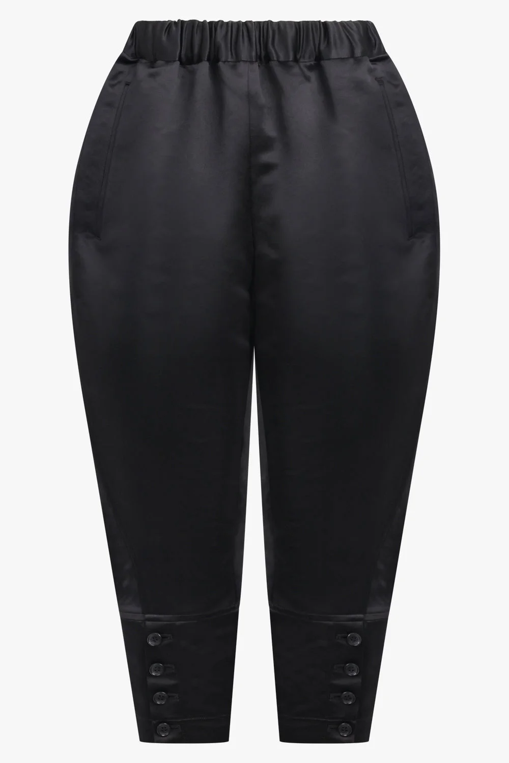 A sculptural take on everyday tailoring, the Elastic Waist Crop Pant with Cuffs in Black by Comme des Garcons balances volume and precision through a distinctly modern silhouette. Crafted from 100% polyester with a smooth, structured finish, the design features a softly exaggerated balloon waist that creates rounded volume through the hips before tapering sharply toward the hem. An elastic waistband enhances comfort while subtly gathering the fabric to emphasise the pant’s curved upper shape. Falling to a cropped length, the legs narrow into fitted cuffs detailed with button accents, reinforcing the tailored edge and drawing focus to the ankle. Two discreet side pockets are seamlessly integrated into the silhouette, maintaining clean lines while offering practical functionality. - Fabrication: 100% polyester - Elastic waistband for flexible, comfortable wear - Balloon-shaped waist for sculptural volume through the hips - Cropped length for a modern, directional proportion - Tapered hem with structured cuffs and button detailing - Two side pockets for everyday practicality - Smooth, structured finish for architectural definition - Black colourway for timeless, versatile styling Pair with a crisp shirt or fitted knit to contrast the exaggerated volume and highlight the pant’s refined, avant-garde tailoring.