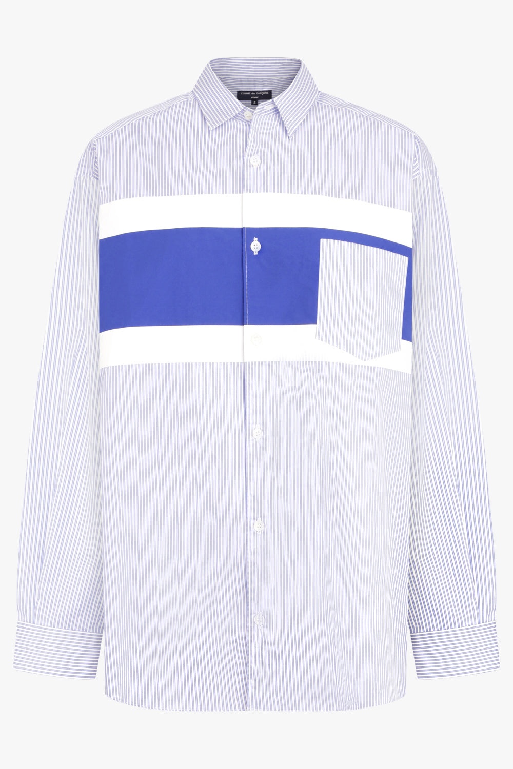 Cotton Stripe -This shirt from Comme des Garcons Shirt is made from breathable cotton poplin. It has a slim silhouette and is finished with an applique patchwork and breast pocket. Fabrication: 100% Cotton Size and Fit Nat: Model is 189cm/6’02” and is wearing a size S Model Measurements: Bust: 96.5cm, Waist: 78cm, Hips 89cm True to size Measurements S: Bust 118cm, Waist 118cm, Hip 118cm, Length 74cm M: Bust 122cm, Waist 122cm, Hip 122cm, Length 74cm