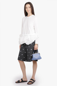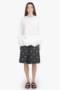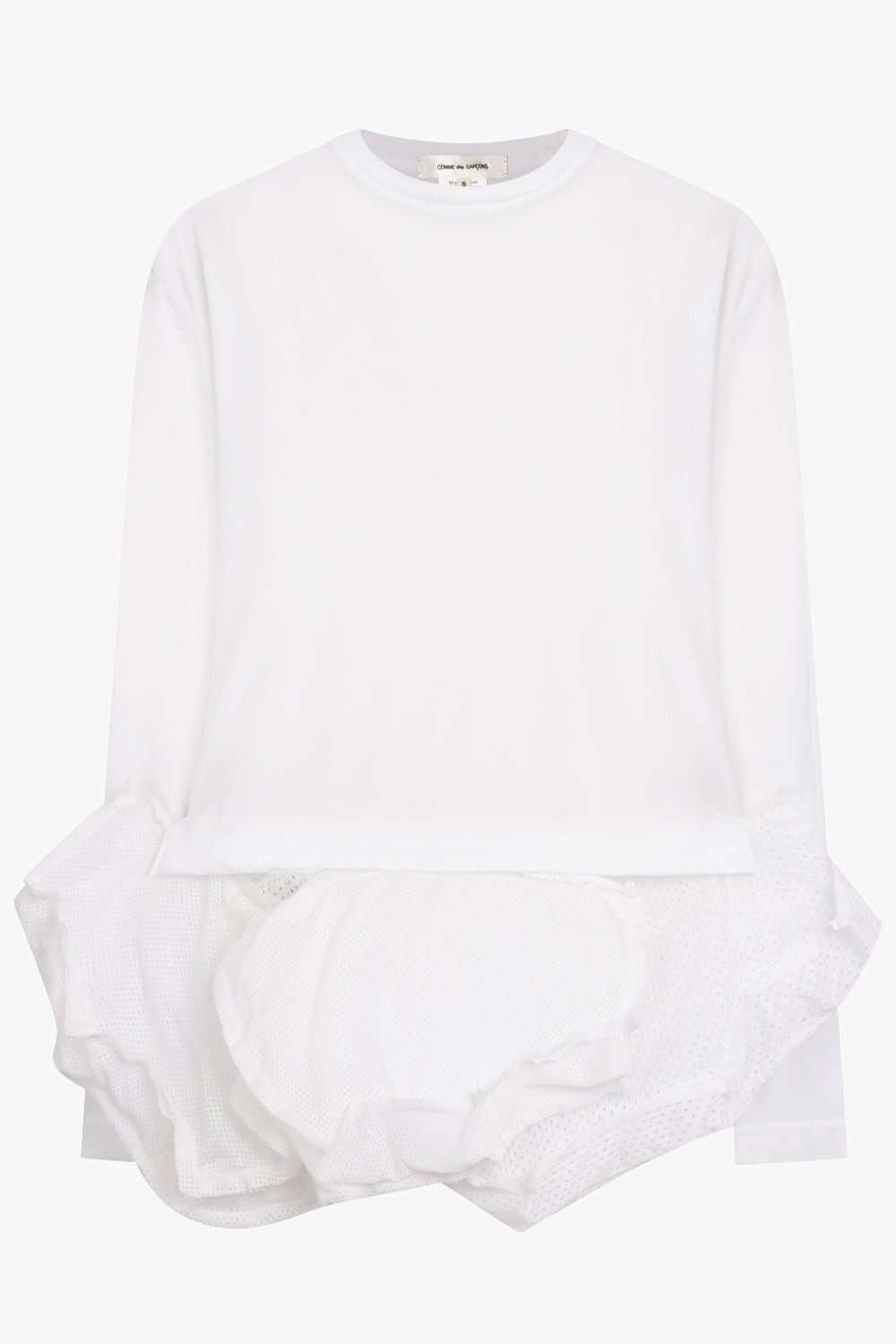 This long-sleeved top features a boxy silhouette crafted in smooth polyester, contrasted by layered mesh panels at the waist that create a subtle, dimensional effect. The asymmetric hem and mixed textures add architectural interest to a minimalist design, offering a directional yet wearable piece for day-to-evening styling. - Fabrication: 100% Polyester (Smooth Body) - Attached Parts: 100% Polyester Mesh (Layered Panels) - Boxy silhouette with long sleeves - Asymmetric hem with thick layered mesh detailing - Lightweight, semi-sheer construction - Clean crew neckline Style with other pieces from Comme Des Garcons to accentuate the structural shape and textural contrast.