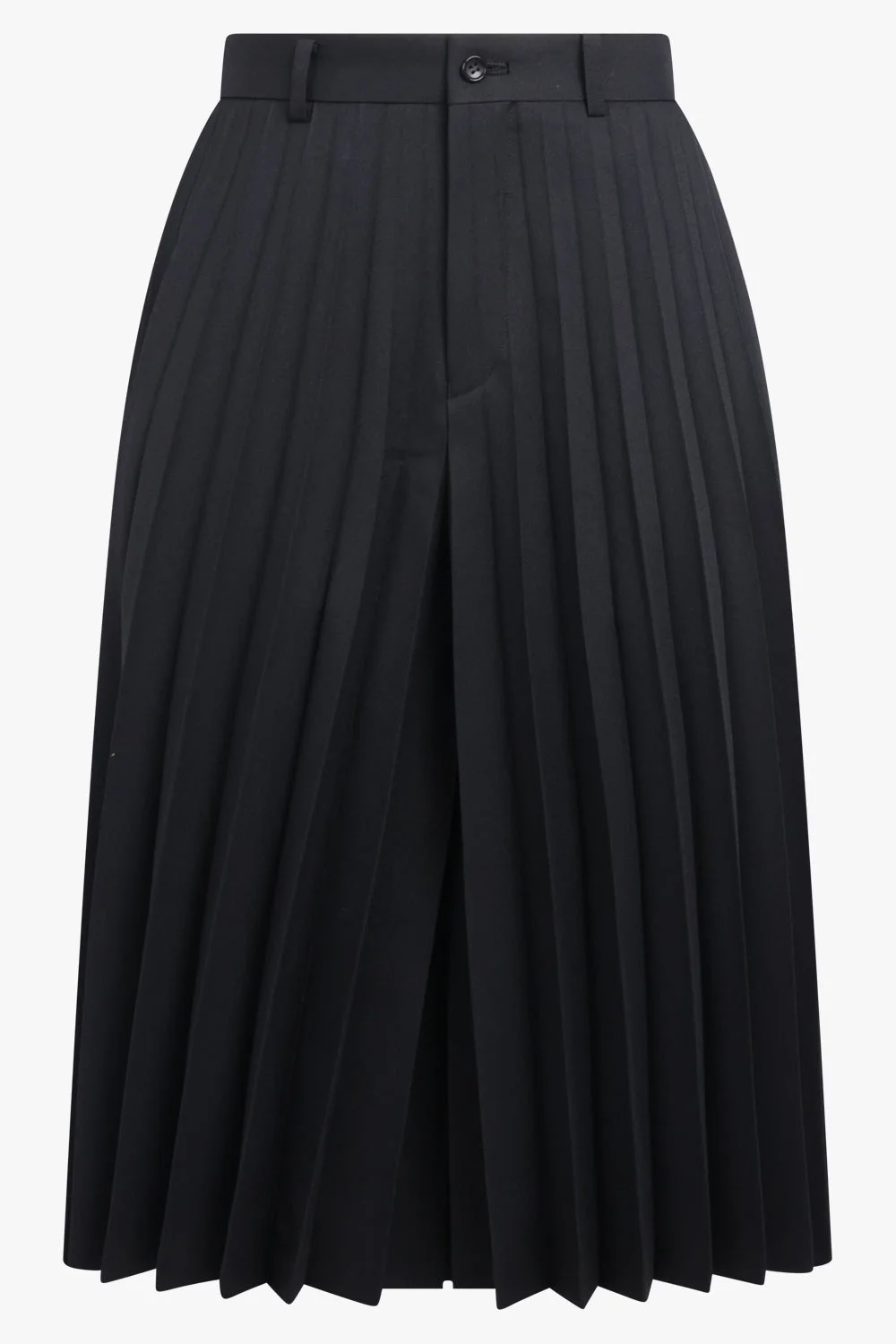 A sculptural take on modern tailoring, the Comme des Garcons Pleat Culotte Pant in Black reinterprets classic structure through volume and movement. Similar in spirit to the Pleat Long Short, this silhouette extends into a wider, calf-grazing culotte length, offering fluidity while maintaining sharp definition. Crisp pleating enhances the architectural shape, creating rhythm and dimension with every step. - Fabrication: 100% Polyester - Culotte silhouette with wide-leg volume for modern proportion - Structured pleats adding depth and sculptural movement - Calf-length cut balancing tailoring with ease - Clean black construction for timeless versatility - Tailored yet expressive design with contemporary edge Style it with a crisp shirt or structured jacket for a sharp, fashion-forward ensemble.
