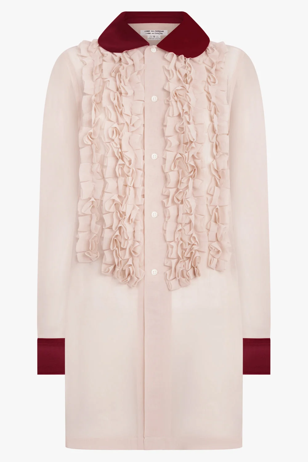 A sophisticated twist on a classic shirt, the COMME DES GARCONS Ruffle Embellish L/S Shirt with Velvet Trim in Beige/Burgundy combines timeless tailoring with elegant detailing. Crafted from 100% polyester, this long-sleeve shirt features subtle ruffle embellishments and velvet trim along the edges, creating a refined, textural contrast that elevates the traditional silhouette. - Fabrication: 100% polyester; Attached Fabric: 100% cotton - Long-sleeve shirt with classic collar - Ruffle embellishments for delicate sculptural interest - Velvet trim adding luxurious textural detail - Relaxed yet tailored fit for polished styling Style it with tailored trousers or a midi skirt and finish the look with heels to elevate the outfit with sophistication and poise. Size and Fit Tiah: Model is 178cm/5’9” and is wearing a size S Model Measurements: Bust: 86cm, Waist: 69cm, Hips 90.5cm Form fitting, stretchy material. Recommended to take usual size.