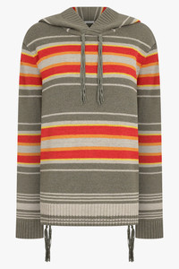 This hoodie features a multicoloured horizontal stripe pattern and is constructed of olive green knitted material. The slouchy hood, long sleeves, and ribbed cuffs and hem add a touch of style. Fringe detailing completes the look Fabrication: Cotton 74%, Polyester 26% Size and Fit Nat: Model is 189cm/6’02” and is wearing a size M Model Measurements: Bust: 96.5cm, Waist: 78cm, Hips 89cm Fits true to size Measurements Size S: Bust 114cm, Waist 108cm, Hip 110cm, Length 70cm Size M: Bust 118cm, Waist 112cm, Hip 114cm, Length 71cm Size L: Bust 122cm, Waist 116cm, Hip 118cm, Length 72cm