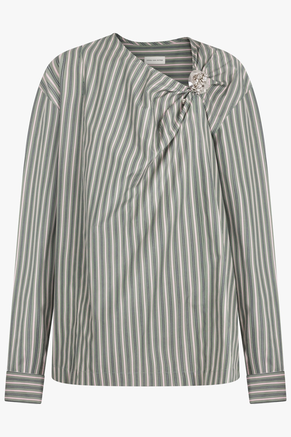 - Striped double twist yarn cotton poplin - Asymmetrical draping - Front knot detail - Long sleeves with buttoned cuffs - Silver shoulder clasp Fabrication: 100% Cotton Size and Fit Sophie: Model is 179cm/5’10” and is wearing a size FR36 Model Measurements: Bust: 76cm, Waist: 61cm, Hips 87.5cm French sizing Designed to be slightly oversized, true to size. Measurements 36: Bust 120cm, Waist 120cm, Hip 120cm, Length 78cm 38: Bust 122cm, Waist 122cm, Hip 122cm, Length 78cm 40: Bust 124cm, Waist 124cm, Hip 124cm, Length 78cm