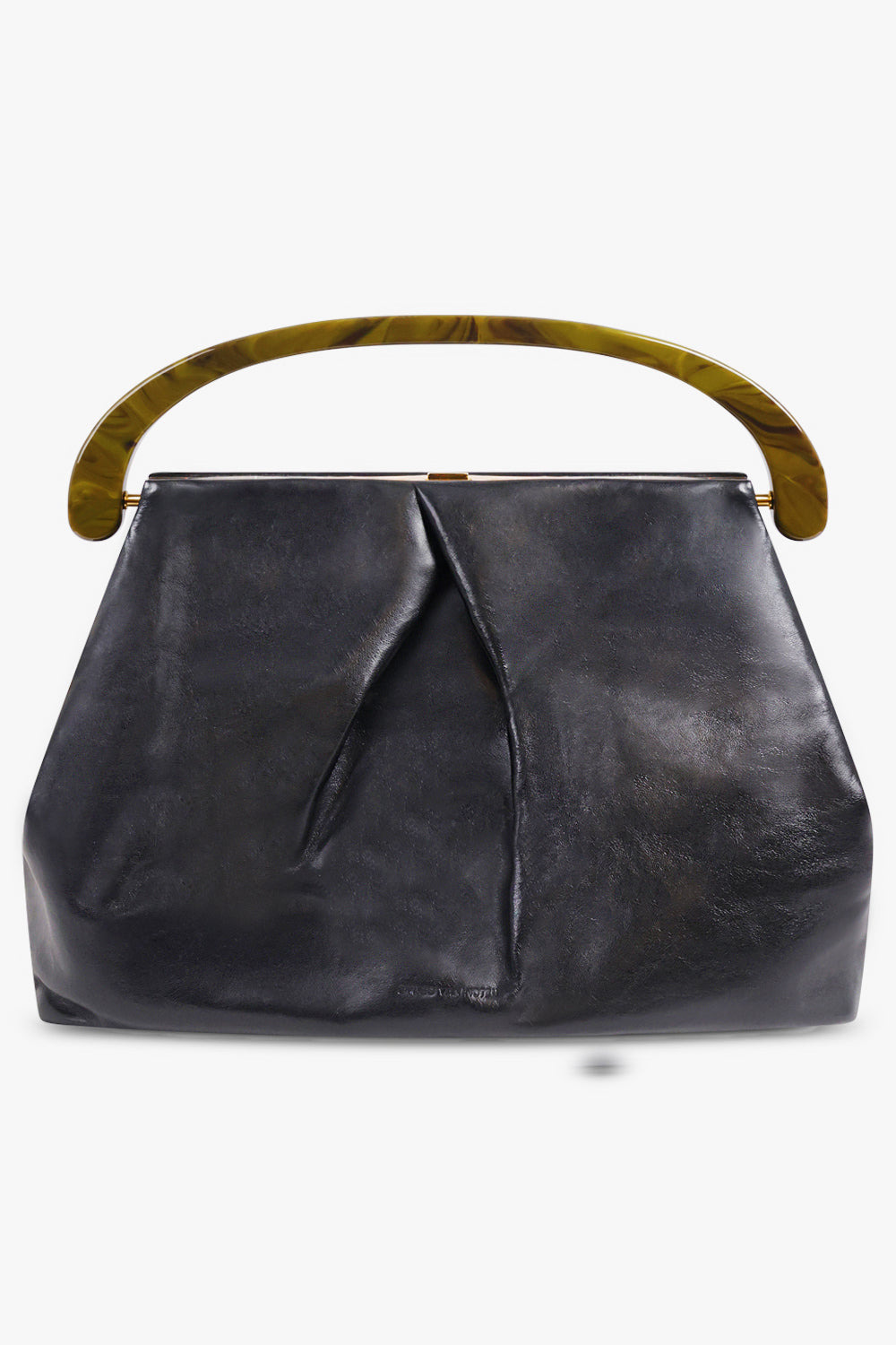 The Medium Resin Handle Tote is crafted from smooth cow leather with a pleated body that creates a refined, sculptural effect. Designed with tonal black resin top handles and accented with gold hardware, the bag combines structure with elegance. It features a detachable, adjustable leather crossbody strap for versatile styling, while the spacious interior is secured with a magnetic snap closure and inner zip pocket. A timeless wardrobe addition, this piece reflects Dries Van Noten’s modern and architectural design language. - Fabrication: 100% cow leather - Pleated leather body - Tonal black resin top handles - Detachable and adjustable leather crossbody strap - Gold hardware - Magnetic snap closure - Inner zip pocket - Comes with Dries Van Noten dust bag Style with Dries Van Noten accessories to finish the look.