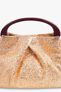 The Mini Resin Handle Crossbody Bag is crafted from foiled crisp leather and accented with a sculptural resin top handle. Designed with a softly pleated body, the compact silhouette balances elegance with everyday versatility. A detachable and adjustable narrow leather strap allows for crossbody or shoulder wear, while the magnetic snap closure secures the interior. An inner zip pocket adds functionality, making it an ideal statement piece for day-to-night styling. - Fabrication: 100% leather - Pleated body design - Foiled reflective crisp exterior in Salmon - Resin top handle - Adjustable and detachable narrow leather crossbody strap - Magnetic snap closure - Inner zipped pocket - Comes with branded dust bag Style with tailored separates or dresses for a refined, modern finish. Measurements Width: 20cm, Depth: 9cm, Height: 17cm