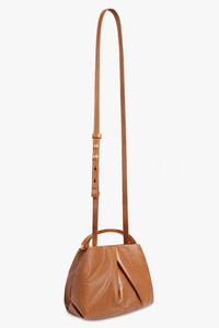 The Mini Resin Handle Bag from Dries Van Noten is presented in a warm tan leather, elevated with matching tan resin top handles for a tonal finish. Crafted from supple cow leather, the compact silhouette is designed with subtle pleating for dimension, while offering versatile wear through its detachable and adjustable leather crossbody strap. The interior features a secure zip pocket and a magnetic snap closure, balancing refined design with practicality. - Fabrication: 100% cow leather - Pleated leather body - Tonal tan resin top handles - Detachable and adjustable leather crossbody strap - Magnetic snap closure - Inner zip pocket - Comes with Dries Van Noten dust bag Style with evening tailoring and Dries Van Noten accessories to finish the look. Measurements Width: 20cm, Depth: 9cm, Height: 17cm