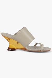 A refined balance of modern minimalism and sculptural design, the Sculptural Wedge 75mm Sandal by Dries Van Noten brings bold sophistication to elevated dressing. Crafted in smooth light green leather, this open-toe mule features a wide strap and toe loop detail for added structure, while the gold-tone sculptural wedge heel adds a futuristic, architectural edge. - Fabrication: 100% leather - Smooth light green leather upper - Sculptural 75mm opaque gold wedge heel - Open toe with wide strap for a clean, modern silhouette - Toe loop accent for added structure and definition - Slip-on mule style for effortless wear - Cushioned leather insole for comfort Pair with statement tailoring or fluid silhouettes, or complete the look with other Dries Van Noten pieces for a bold, directional style. Measurements 75mm Heel Height
