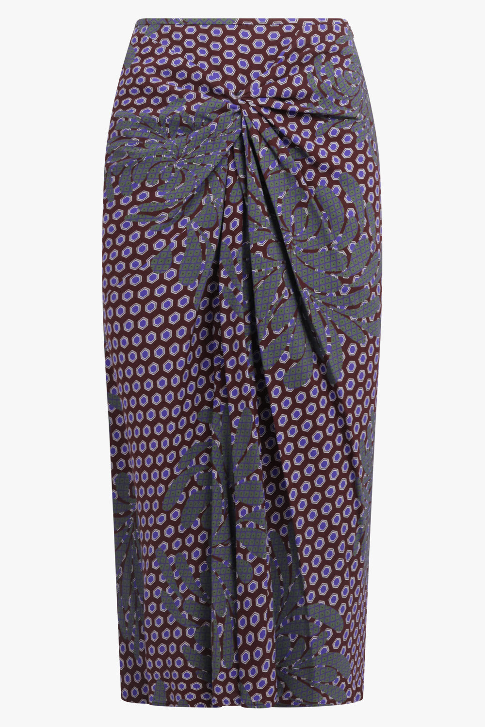 The Dries Van Noten Smila Draped Mosaique Print Midi Skirt in Auber Purple is a sophisticated and sculptural piece that embodies the designer’s signature approach to pattern and form. Crafted from lightweight fabric, it features a bold interplay of geometric hexagonal shapes and abstract floral motifs in deep tones of aubergine, blue, and green. The fluid draping gathers into a twisted front detail, creating a flattering, asymmetrical silhouette that enhances movement and visual depth. Falling to a mid-length, this piece perfectly balances elegance and modernity. - Fabrication: 100% polyester - Mid-length silhouette with front twist and draped detailing - All-over geometric and floral motif - Lightweight fabric with a smooth, fluid drape - Concealed side zip closure Style it with the matching Celindra shirt or a minimalist top to highlight the skirt’s dynamic print and sculptural draping. Size and Fit Tiah: Model is 178cm/5’9” and is wearing a size FR36 Model Measurements: Bust: 86cm, Waist: 69cm, Hips 90.5cm This style runs slightly big, sitting lower on the waist Measurements Size 36: Waist 72cm, Hip 80cm, Length 89cm Size 38: Waist 74cm, Hip 82cm, Length 89cm Size 40: Waist 78cm, Hip 86cm, Length 89cm Size 42:Waist 82cm, Hip 90cm, Length 89cm