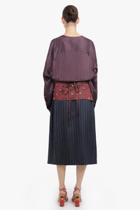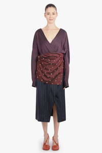 The Dries Van Noten Soly Diamond Print Wrap Midi Skirt with Embellished Layer in Burgundy is a striking example of the house’s artful fusion of texture, pattern, and craftsmanship. This wrap-style skirt features a richly detailed diamond print overlay in deep burgundy, adorned with delicate, multicoloured embellishments that add dimension and a touch of opulence. The contrast underlayer, crafted from navy pinstripe fabric, lends tailored precision to the fluid, asymmetrical drape of the top layer. Finished with a side tie closure and a front slit, the design balances intricate embellishment with contemporary ease. - Fabrication: 100% polyester - Midi-length wrap silhouette with side tie fastening - Embellished diamond print overlay for texture and luminosity - Contrasting navy pinstripe under layer with front slit - Lightweight fabric with soft, structured drape - Button and tie closures Style it with a sleek blouse or knit for a refined day-to-evening look that highlights the skirt’s textural interplay and sophisticated detailing. Size and Fit Tiah: Model is 178cm/5’9” and is wearing a size FR36 Model Measurements: Bust: 86cm, Waist: 69cm, Hips 90.5cm This style is a wrap style and is slightly relaxed Measurements Size 36: Waist 68cm, Hip 82cm, Length 78cm Size 38: Waist 74cm, Hip 86cm, Length 78cm Size 40: Waist 80cm, Hip 90cm, Length 78cm