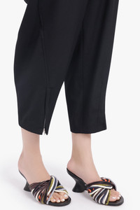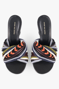 These 75MM Twist Velvet Cord Wedge Mules feature a luxurious combination of 100% leather and braided velvet, designed with a structured knot detail across the upper for a sculptural effect. The slip-on silhouette is completed with a curved wedge heel, balancing elevated style with wearability. The black-and-multi colourway adds depth and visual interest, making these mules a refined statement piece. - Fabrication: 100% Leather (upper) with braided velvet detail - Slip-on style for effortless wear - Open-toe design - Curved 75MM wedge heel - Structured knot detail - Black/multi colourway - Cushioned insole for comfort - Sculptural, elevated silhouette Perfect for adding a statement to both day and evening ensembles. Size and Fit Italian sizing. We recommend taking a full size up as it's a very narrow fit through the front of the mule. Even if you have narrow feet, still size up, the material around the arch of the foot won't give that much. Measurements Heel Height: 75mm
