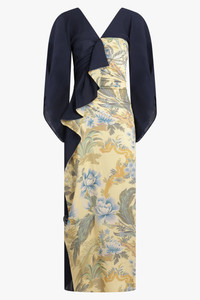- Fabrication: 97% viscose, 3% elastane - V-neck style - 3/4 kimono style sleeves - Slightly sheer - Ruffle front detail - Centre back zip closure with ruched detailing - Midi length Size and Fit Sophie: Model is 189cm/6’02” and is wearing a size 38 Model Measurements: Bust: 76cm, Waist: 61cm, Hips 87.5cm Fits true to size Measurements Size 38: Bust 72cm, Waist 68cm, Hip 68cm, Length 145cm Size 40: Bust 76cm, Waist 72cm, Hip 72cm, Length 145cm Size 42: Bust 80cm, Waist 76cm, Hip 76cm, Length 145cm Size 44: Bust 84cm, Waist 80cm, Hip 80cm, Length 145cm