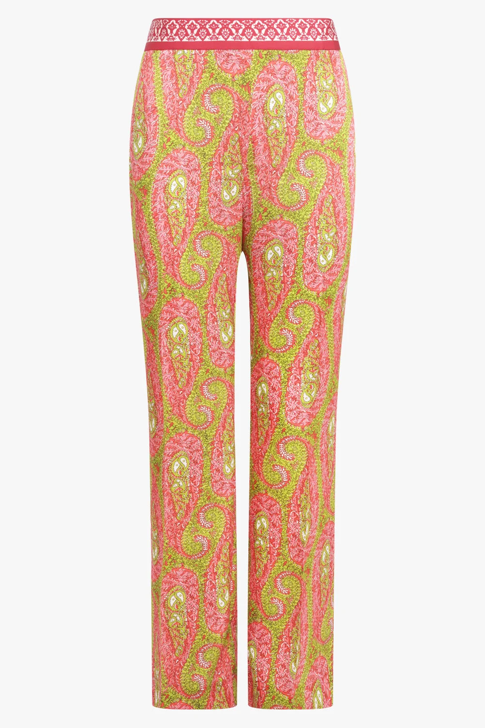 A signature expression of ETRO’s bohemian elegance, the Paisley Print Straight Leg Pant in Green/Pink delivers effortless sophistication with a rich, graphic edge. Defined by the house’s iconic paisley motif, this pant balances fluid movement with a clean straight-leg silhouette, creating a statement piece that remains easy to wear. The deep navy base enriched with multicolour detailing adds depth and contrast, while the relaxed construction allows the print to flow beautifully with movement. - Fabrication: 100% Polyester - Straight-leg silhouette with exaggerated fluidity for effortless drape - Iconic paisley print throughout for a distinctive ETRO finish - Elasticated waistband with drawstring detail, allowing adjustable styling - Wear cinched at the waist for a defined shape or relaxed for a fluid, laid-back feel - Lightweight construction designed for comfort and movement - Green/Pink colourway offering a refined yet expressive take on print Style it with the matching top for a coordinated look, or balance the bold print with a shirt. Measurements 40: Waist 70cm, Hip 94cm, Length 99cm 42: Waist 74cm, Hip 98cm, Length 99cm 44: Waist 78cm, Hip 102cm, Length 99cm