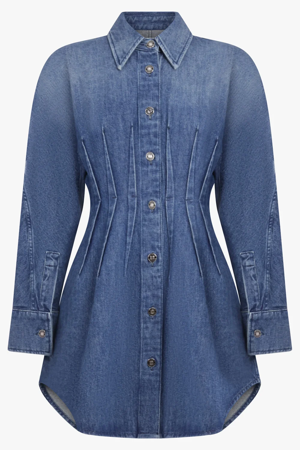 A masterclass in sculptural denim, the Cocoon Short Waisted Denim Dress by Givenchy reimagines classic tailoring with architectural volume and couture detailing. Crafted from medium blue cotton denim, this long-sleeve mini dress features inverted seams and reworked patterns to create the signature cocoon silhouette. A classic collar, buttoned cuffs, and button closure provide traditional denim structure, while pleated details at the front and back enhance movement and dimensionality. The waist is cinched for flattering definition, completed with GIVENCHY engraved buttons and a leather patch at the upper back for a signature touch. - Fabrication: 100% cotton - Medium blue denim construction with exaggerated cocoon volume - Long sleeves with buttoned cuffs and classic collar for traditional tailoring - Inverted seams and reworked patterns for sculptural shaping - Cinched waist for a flattering silhouette - Pleated detailing at front and back adds dimension and movement - Button closure with GIVENCHY engraved buttons - GIVENCHY leather patch at the upper back for signature branding Style it with sleek ankle boots or minimalist heels to highlight the architectural volume and refined couture detailing. Size and Fit Tiah: Model is 178cm/5’9” and is wearing a size FR38 Model Measurements: Bust: 86cm, Waist: 69cm, Hips 90.5cm Fits true to size Measurements 36: Bust 74cm, Waist 66cm, Hip 94cm, Length 80cm 38: Bust 76cm, Waist 68cm, Hip 96cm, Length 80cm 40: Bust 80cm, Waist 72cm, Hip 100cm, Length 80cm