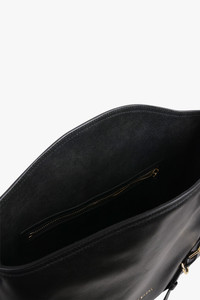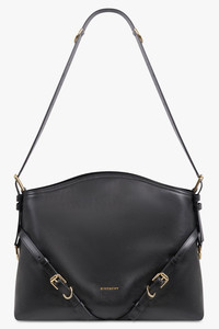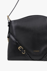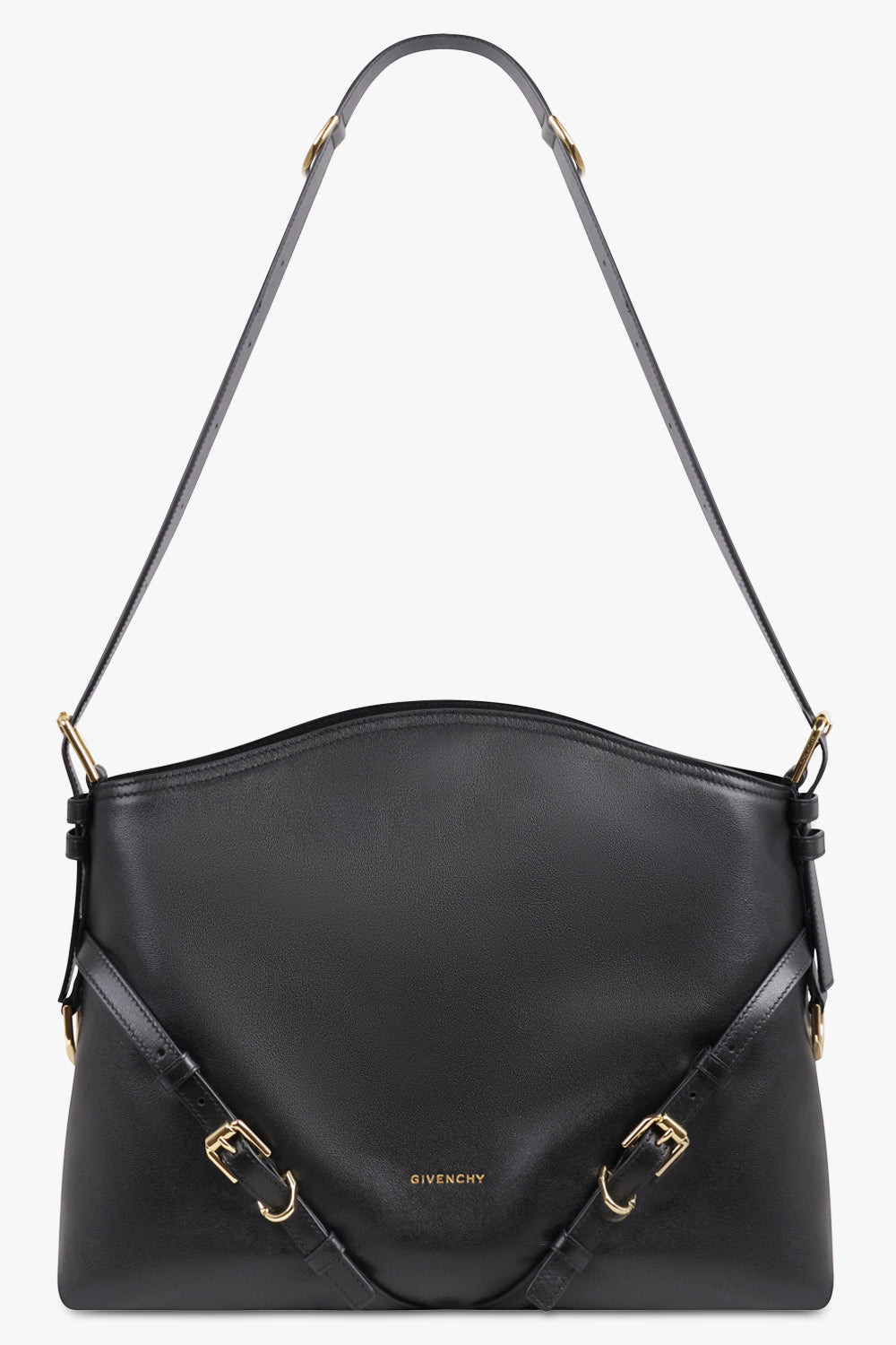 The Medium Voyou Bag by Givenchy is crafted from elevated smooth calfskin leather, offering a finish with natural depth. Its signature V-shaped slouchy silhouette blends structure and softness, with generous volume that enhances its sculptural shape. The adjustable strap allows for hand, shoulder, or crossbody wear, while gold-toned metal buckles and subtle Givenchy signatures add refined detailing. - Fabrication 100% calfskin leather - Colour black - Smooth, shiny leather with natural structure - V-shaped silhouette with soft, slouched form - Adjustable strap for shoulder, crossbody or handheld carry - GIVENCHY logo embossed on front and top - Gold-tone engraved metal hardware - One main compartment and one internal zipped pocket - Lined in suede Style with oversized tailoring or Givenchy shoes. Measurements Width: 38.1 cm, Height: 27.94 cm, Depth: 9.91 cm Strap length min: 24.89 cm Strap length max: 55.12 cm