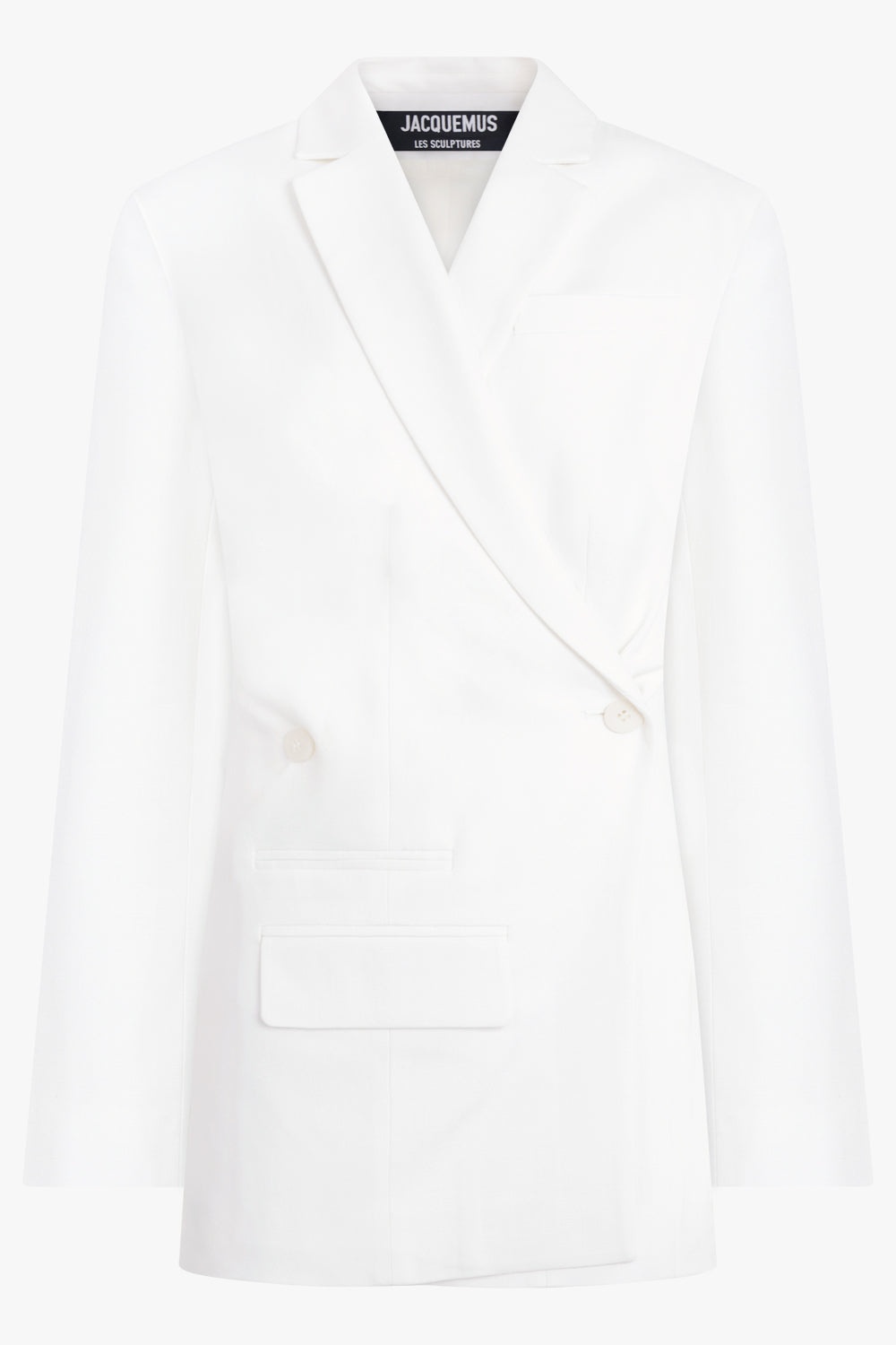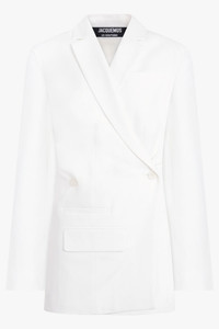 La Veste Tibau is a crossover double breasted blazer with structured shoulders, in a fitted design. A cinched and draped waist is complemented by a chest welt pocket and sleeve slits, as well as buttonholes with contrast stitch detail. Fabrication: 100% Viscose Size and Fit Nikita: Model is 174cm/5’7” and is wearing a size 34 Model Measurements: Bust: 30cm, Waist: 26.5cm, Hips 34cm French Sizing Fits true to size Measurements Size 34: Bust 86cm, Waist 72cm, Hips 76cm, Length 76cm Size 36: Bust 90cm, Waist 76cm, Hips 80cm, Length 76cm Size 38: Bust 92cm, Waist 78cm, Hips 82cm, Length 76cm Size 40: Bust 96cm, Waist 82cm, Hips 86cm, Length 76cm