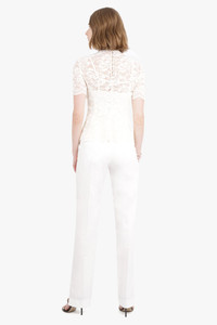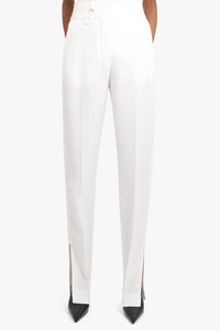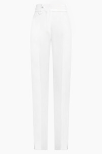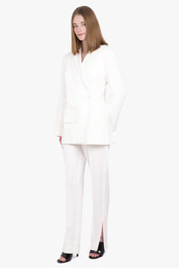 Le Pantalon Tibau from Jacquemus is a modern take on the white pant. Crafted from a viscose fabric with a high waist fit, these pants are finished with tapered legs, loose pleats and side slits on the base hem. A hidden zip closure with hook and button, as well as side and back pockets finish this garment. Fabrication: 100% Viscose Size and Fit Nikita: Model is 174cm/5’7” and is wearing size 34 Model Measurements: Bust: 30cm, Waist: 26.5cm, Hips 34cm French Sizing Fits true to size Measurements Size 34: Waist 66cm, Hips 84cm, Length 117cm Size 36: Waist 72cm, Hips 90cm, Length 117cm Size 38: Waist 74cm, Hips 92cm, Length 117cm Size 40: Waist 80cm, Hips 96cm, Length 117cm