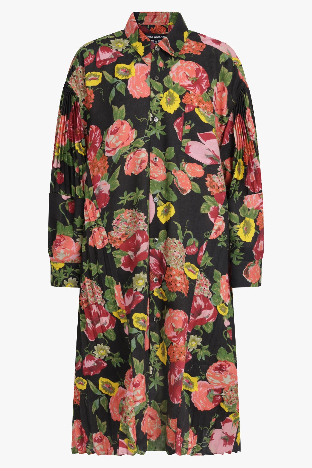 FLORAL PRINT L/S PLEAT MIDI SHIRT DRESS | BLACK/PINK