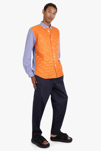Stripes are never out of style, especially when they're from Junya Watanabe MAN. Formed in 1992 under the umbrella of Comme des Garcons, this fashion line has always been a trendsetter. This over shirt, with its playful white, blue, and orange broad stripes, is no exception. Crafted from quilted fabric, it's as comfortable as it is stylish. Fabrication: Cotton 100%, Nylon 100% Size and Fit Alex: Model is 183cm/6’00” and is wearing a size S Model Measurements: Bust: 81cm, Waist: 75cm, Hips 81cm Fits true to size Measurements Size S: Bust 112cm, Waist 112cm, Hips 112cm, Length 77cm Size M: Bust 116cm, Waist 116cm, Hips 116cm, Length 77cm Size L: Bust 122cm, Waist 122cm, Hips 122cm, Length 77cm Size XL: Bust 126cm, Waist 126cm, Hips 126cm, Length 77cm