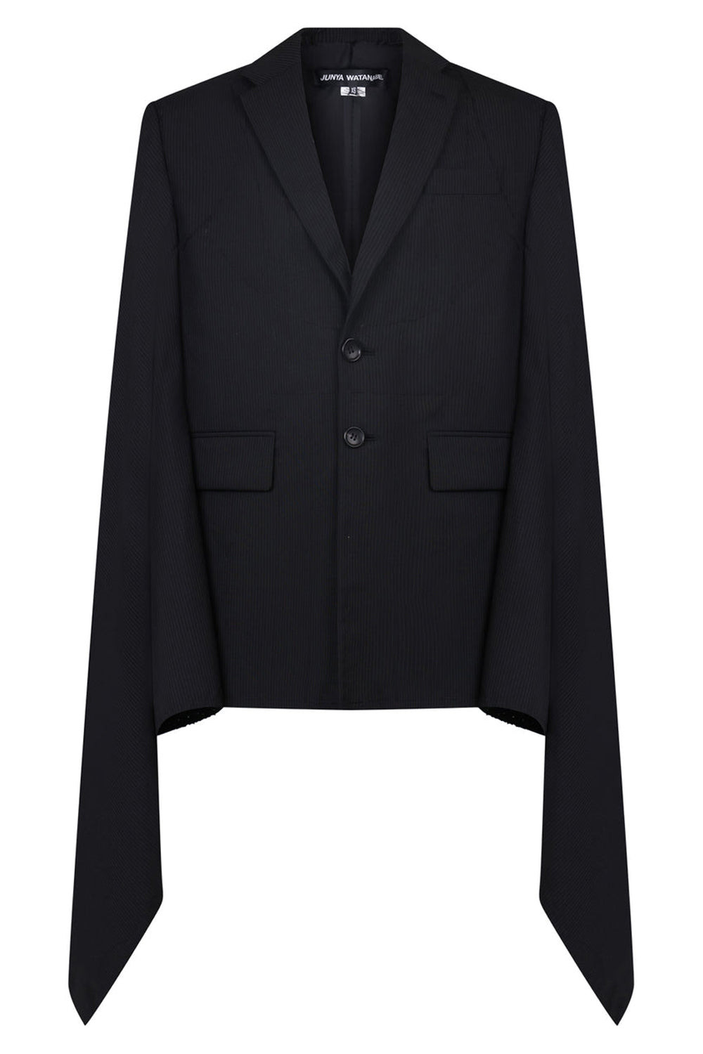 The Junya Watanabe Oversized Cape Sleeve Blazer is crafted from Mohair Stripe Wool mix/ This style features an exaggerated, wide frame and cascading cape-style sleeves, with exposed stitching to the front of the blazer. Fabrication: 76% Wool, 21% Mohair, 3% Polyester Size and Fit Lacey: Model is 180cm/5’11” and is wearing a size S Model Measurements: Bust: 86cm, Waist: 72cm, Hips 89cm Measurements Size XS: Bust: 92cm, Waist 92cm, Length 92cm Size S: Bust: 96cm, Waist 96cm, Length 96cm