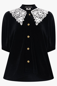 Elegant and quietly dramatic, the Relaxed Velvet Short-Sleeve Blouse with Crochet Collar by Junya Watanabe combines a sculptural silhouette with romantic, textural contrast. Crafted in deep black velvet, it drapes softly to highlight the fabric’s natural depth and sheen, while the crisp white crochet collar frames the neckline with delicate, ornamental detail. Softly gathered short sleeves balance volume and structure, and gold-tone buttons down the front add a subtle, vintage-inspired accent, creating a refined piece that merges Junya Watanabe’s sculptural sensibility with heritage-inspired charm. - Fabrication: - Velvet: 90% Polyester, 10% Polyurethane - Lace: 100% Cotton - Soft black velvet with a fluid, relaxed drape - Statement white crochet collar for intricate contrast and visual framing - Short sleeves with gentle gathering for volume and softness - Gold-tone front buttons adding a polished, vintage touch Style it with tailored trousers or a sleek skirt to highlight the bold collar contrast and the richness of the velvet Size and Fit Tiah: Model is 178cm/5’9” and is wearing a size S Model Measurements: Bust: 86cm, Waist: 69cm, Hips 90.5cm Fits true to size Measurements S: Bust 90cm, Waist 90cm, Hip 120cm, Length 60cm M: Bust 94cm, Waist 94cm, Hip 130cm, Length 60cm