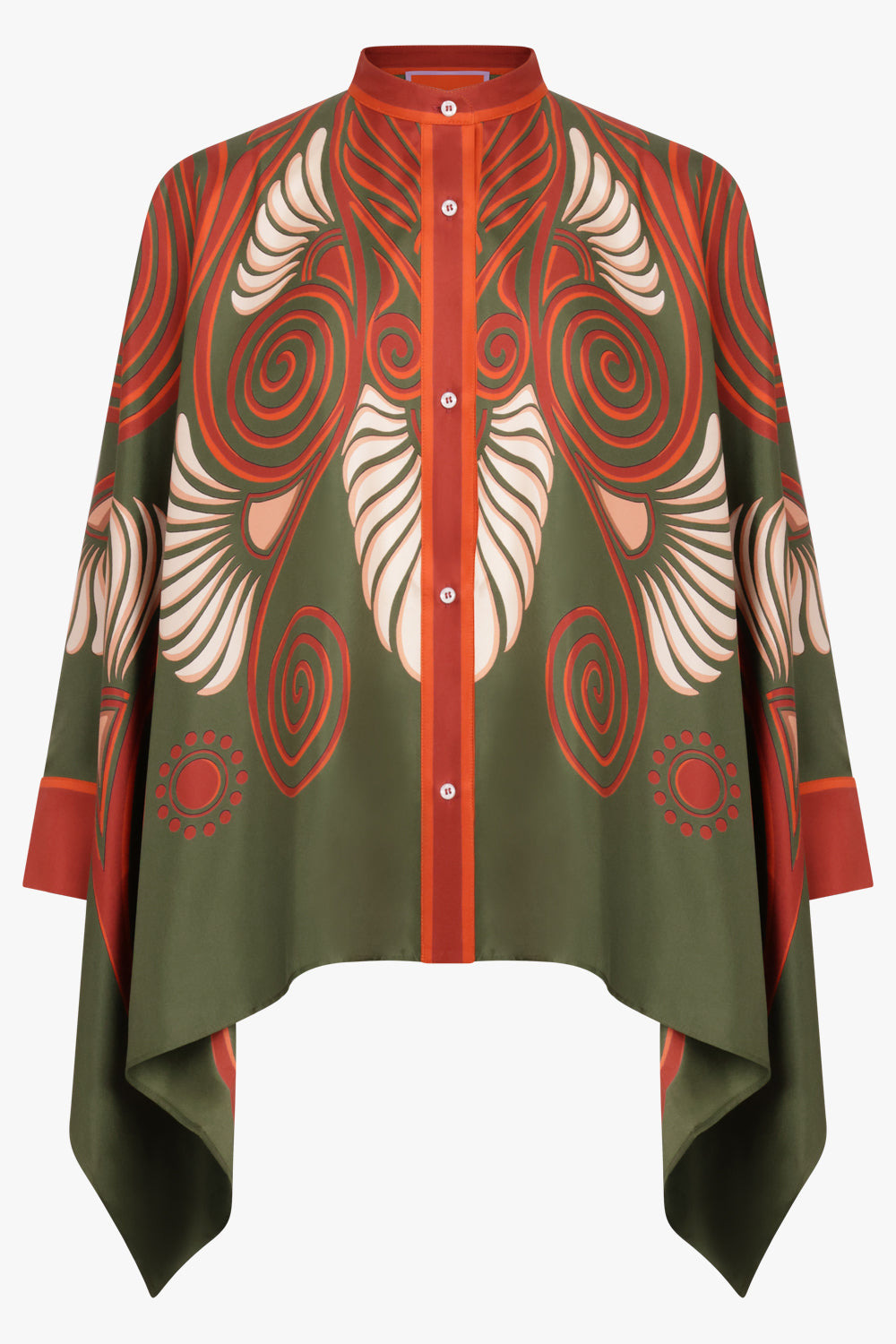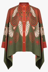 - Korean collar - Centre front button closure - Fluid handkerchief style hemline - Placement Kerylos Placee print - 3/4 sleeve length - Button cuffs - Silk twill material Fabrication: 100% Silk Size and Fit Sophie: Model is 179cm/5’10” and is wearing a size XS Model Measurements: Bust: 76cm, Waist: 61cm, Hips 87.5cm Fits true to size Measurements Size XXS: Bust 88cm, Waist 88cm, Hips 88cm, Length 85cm Size XS: Bust 90cm, Waist 90cm, Hips 90cm, Length 85cm Size S: Bust 92cm, Waist 92cm, Hips 92cm, Length 85cm Size M: Bust 96cm, Waist 96cm, Hips 96cm, Length 85cm