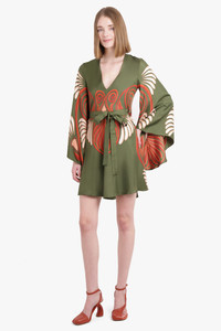 - Deep V front neckline - Detachable sash belt - Placement Kerylos Placee print - Concealed side seam pockets - Reversible style Wide bell sleeves - Silk twill material Fabrication: 100% silk Size and Fit Sophie: Model is 179cm/5’10” and is wearing a size XS Model Measurements: Bust: 76cm, Waist: 61cm, Hips 87.5cm Fits true to size Measurements Size XS: Bust 86cm, Waist 82cm, Hips 108cm, Length 91cm SizeS S: Bust 88cm, Waist 84cm, Hips 110cm, Length 91cm Size M: Bust 92cm, Waist 88cm, Hips 114cm, Length 91cm Size L: Bust 94cm, Waist 90cm, Hips 116cm, Length 91cm