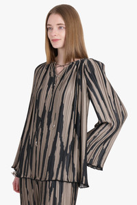 - Fabrication: 100% Polyester - Satin finish - Plisse effect - Abstract pattern print - Gathered neckline - Front tie fastening - Long raglan sleeves - Lettuce hem Size and Fit Sophie: Model is 179cm/5’10” and is wearing a size IT36 Model Measurements: Bust: 76cm, Waist: 61cm, Hips 87.5cm Italian sizing Fits true to size Measurements 36: Bust 100cm, Waist 100cm, Hip 100cm, Length 73cm 38: Bust 102cm, Waist 102cm, Hip 102cm, Length 73cm