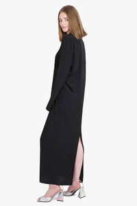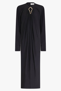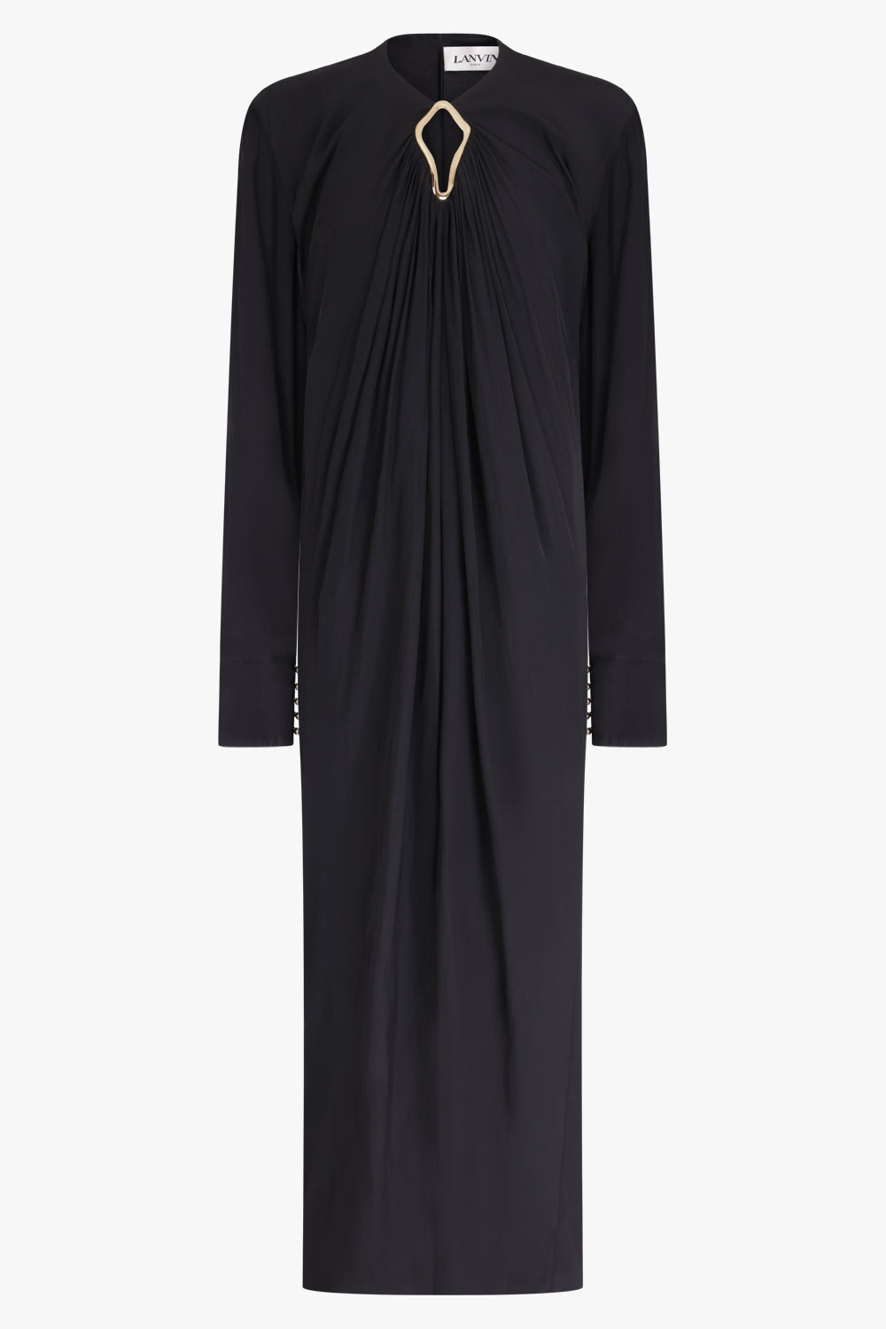 Lanvin's Draped Long Dress with brass piece in the centre creating a ruching effect. this dress features a black slit with long sleeves and buttoned cuffs. Fabrication: 100% Polyester Woven Size and Fit Nikita: Model is 174cm/5’7” and is wearing a size FR36 Model Measurements: Bust: 30cm, Waist: 26.5cm, Hips 34cm French Sizing Fits true to size Measurements Size 36: Bust 100cm, Waist 100cm, Hip 100cm, Length 146cm Size 38: Bust 106cm, Waist 106cm, Hip 106cm, Length 146cm Size 40: Bust 108cm, Waist 108cm, Hip 108cm, Length 146cm