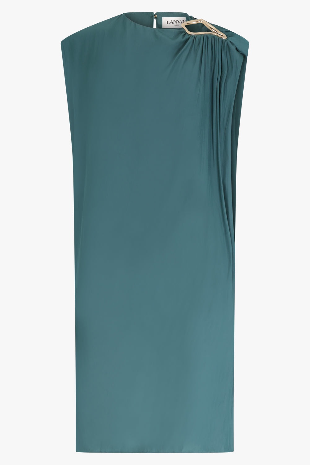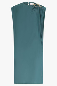 Lanvin's Sleeveless Draped Knee Dress boasts side slits and a brass shoulder piece on the left shoulder which offers a ruching effect. Fabrication: 100% Polyester Woven Size and Fit Nikita: Model is 174cm/5’7” and is wearing a size FR36 Model Measurements: Bust: 30cm, Waist: 26.5cm, Hips 34cm French Sizing Fits true to size Measurements Size 36: Bust 100cm, Waist 100cm, Hip 100cm, Length 146cm Size 38: Bust 104cm, Waist 104cm, Hip 104cm, Length 146cm Size 40: Bust 106cm, Waist 106cm, Hip 106cm, Length 146cm