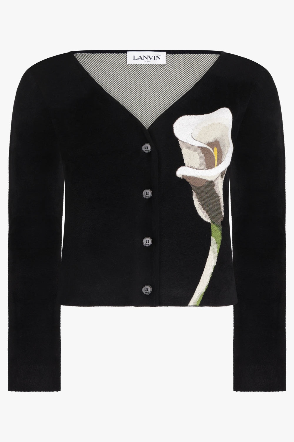 Featuring a knit Calla Lily on the left hand side and a V-neck button up, this Jacquard V Neck Cropped Cardigan is fully knitted with long sleeves. Fabrication: 44% Polyamide Knitted 5% Polyester Knitted Size and Fit Sophie: Model is 189cm/6’02” and is wearing a size XS Model Measurements: Bust: 76cm, Waist: 61cm, Hips 87.5cm Fits true to size Measurements Size XS: Bust 84cm, Waist 76cm, Hip 78cm, Length 52cm Size S: Bust 88cm, Waist 80cm, Hip 82cm, Length 52cm Size M: Bust 92cm, Waist 84cm, Hip 86cm, Length 52cm Size L: Bust 96cm, Waist 84cm, Hip 90cm, Length 52cm