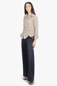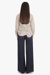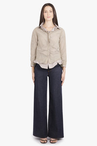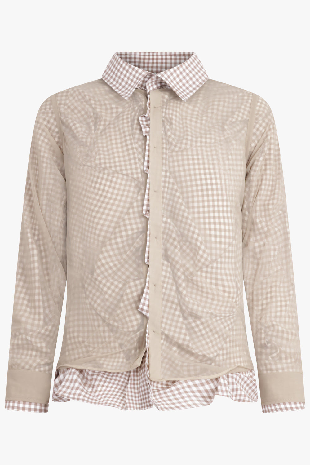 A study in subversion and structure, the Layered Long-Sleeved Shirt by Maison Margiela reimagines the classic check shirt through the lens of deconstruction. Crafted with a cotton base and an ultrasheer polyester jersey overlay, the double-layer silhouette plays with proportion and transparency. The outer sheer layer is slightly cropped and ruched through the sleeves and back, creating unexpected volume and tension. A pointed collar and front button placket ground the design in tradition, while the signature four white stitches at the back mark the Maison’s quietly radical identity. - Primary Fabric: 100% Cotton - Secondary Fabric: 100% Polyester - Double-layered construction with sheer overlay - Classic check print cotton shirt with sheer poly-jersey top - Ruched detailing at sleeves and back for sculptural shape - Pointed collar with button fastening at neck - Slightly cropped long sleeves with layered contrast - Signature four white stitches at the back - Button up front allows for multiwear. Pair with deconstructed trousers or minimalist tailoring to echo Margiela’s conceptual aesthetic. Measurements 38: Bust 86cm, Waist 80cm, Hip 72cm, Length 65cm 40: Bust 88cm, Waist 82cm, Hip 74cm, Length 65cm 42: Bust 92cm, Waist 86cm, Hip 78cm, Length 65cm 44: Bust 96cm, Waist 90cm, Hip 82cm, Length 65cm 46: Bust 100cm, Waist 94cm, Hip 86cm, Length 65cm