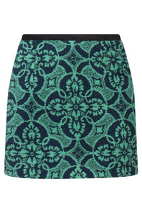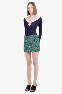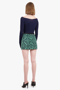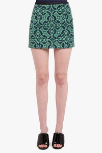 Marine Serre's Oriental Mini Skirt in Bright Green is made from up-cycled jacquard towels and is inspired by 90's Paris runways. Finished with a black trim at the waist, it is the perfect length for its style. Fabrication: 100% Cotton. Size and Fit Sophie: Model is 189cm/6’02” and is wearing a size FR36 Model Measurements: Bust: 76cm, Waist: 61cm, Hips 87.5cm French Sizing Fits true to size