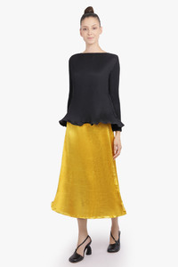 A modern reimagining of classic tailoring, the Zigzag Ripple Midi Skirt in Gold offers a sculptural silhouette with contemporary edge. Crafted from a subtly textured fabric, this midi skirt features an elastic waistband for comfortable, easy wear, and a unique bendable metal hem, allowing you to manipulate the base for customizable shapes and styling options. Its versatile design makes it a standout piece for polished ensembles. - Elastic waistband for comfort and easy fit - Bendable metal hem for adjustable shapes and versatile styling - Subtle ripple texture adds depth and visual interest - Midi length with a straight silhouette for a flattering fit - Striking gold metallic colourway Style it with the matching Zigzag L/S Ripple Top or a sleek blouse to create a coordinated, modern look. Size and Fit Tiah: Model is 178cm/5’9” and is wearing a size S Model Measurements: Bust: 86cm, Waist: 69cm, Hips 90.5cm Fits true to size
