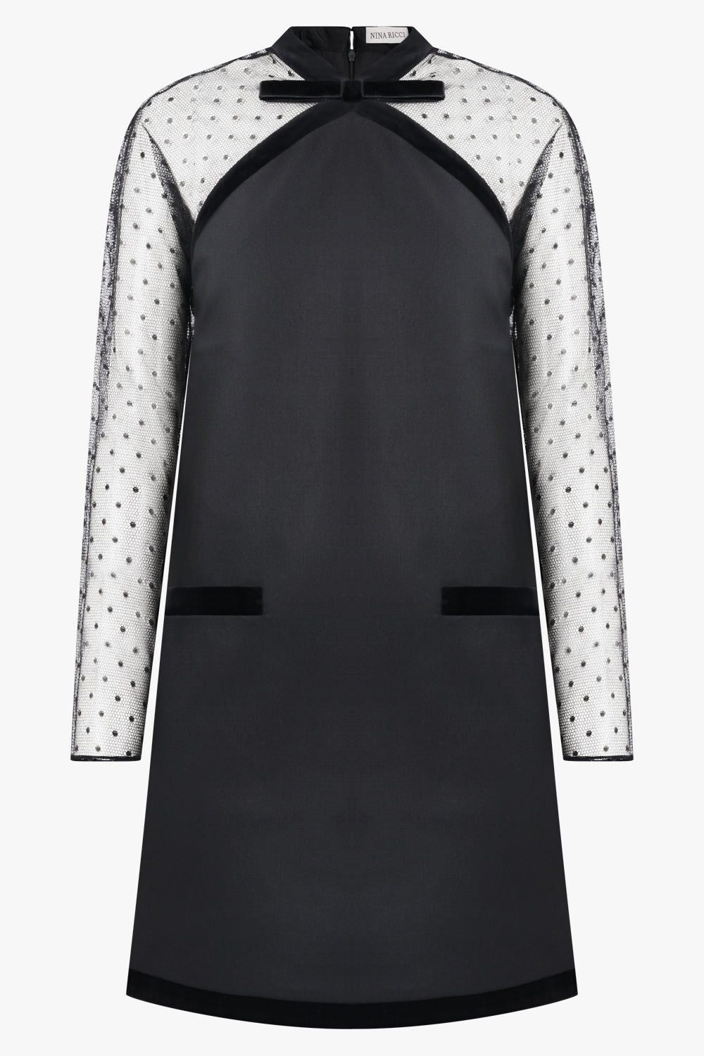 The Nina Ricci Polka Dot Tulle Mini Dress in Black is crafted from a blend of structured crepe and sheer dotted tulle, creating a refined contrast between opaque and transparent textures. The dress features long, semi-sheer sleeves adorned with delicate velvet polka dots, while the solid black body offers a sleek, minimalist silhouette. A velvet trim outlines the neckline and shoulders, meeting at a chic velvet bow detail that adds a touch of vintage-inspired elegance. Finishing touches include discreet velvet-trimmed pockets and a subtle A-line shape that flatters the form while maintaining an air of sophistication. - Fabrication: 100% polyester - Mini-length, A-line silhouette - Sheer polka dot tulle sleeves with velvet trim detailing - Velvet bow at neckline for a refined accent - Hidden back zip closure for a seamless finish - Fully lined body for coverage and structure Style it with sleek black heels and understated Nina Ricci jewellery to highlight the play of textures and the refined silhouette. Size and Fit Tiah: Model is 178cm/5’9” and is wearing a size FR36 Model Measurements: Bust: 86cm, Waist: 69cm, Hips 90.5cm This style fits true to size Measurements Size 36: Bust 80cm, Waist 86cm, Hip 86cm, Length 86cm Size 38: Bust 86cm, Waist 90cm, Hip 90cm, Length 86cm Size 40: Bust 88cm, Waist 92cm, Hip 92cm, Length 86cm