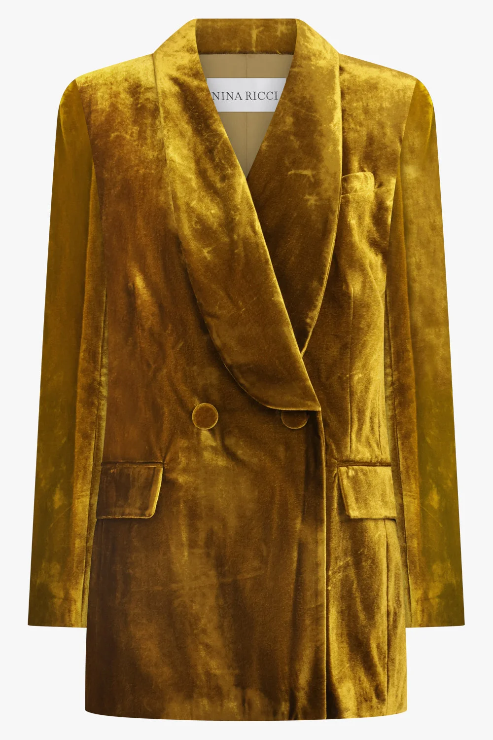 A statement piece with unmistakable Parisian elegance, the Nina Ricci Double Breast Velvet Jacket in Gold redefines tailoring through a lens of luxury and modern glamour. Crafted in plush velvet with a soft lustre, this jacket delivers a rich, tactile finish that elevates classic suiting into evening-ready territory. The double-breasted silhouette brings structure and authority, while the warm gold hue adds depth, drama, and refinement. Designed to contour the body with precision, it balances bold presence with timeless sophistication. Fabrication: 75% Viscose, 25% Polyamide Luxurious velvet fabrication with a smooth, light-catching sheen Structured double-breasted design for a sharp, tailored profile Sculpted silhouette that enhances and defines the form Polished lapels and refined finishing details for a couture feel Gold tone for elevated statement dressing Style it with the matching trousers for a powerful suit moment, or layer over a silk top and tailored pants for a refined evening look. Size and Fit Tiah: Model is 178cm/5’9” and is wearing a size FR36 Model Measurements: Bust: 86cm, Waist: 69cm, Hips 90.5cm The Double Breast Velvet Jacket fits true to size and is designed to sit slightly oversized. It offers ample room through the bust while maintaining a structured silhouette. Take your usual size for the intended fit. Measurements 34: Bust cm, Waist cm, Hip cm, Length cm 36: Bust cm, Waist cm, Hip cm, Length cm 38: Bust 102cm, Waist 100cm, Hip 100cm, Length 77cm