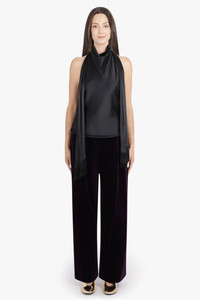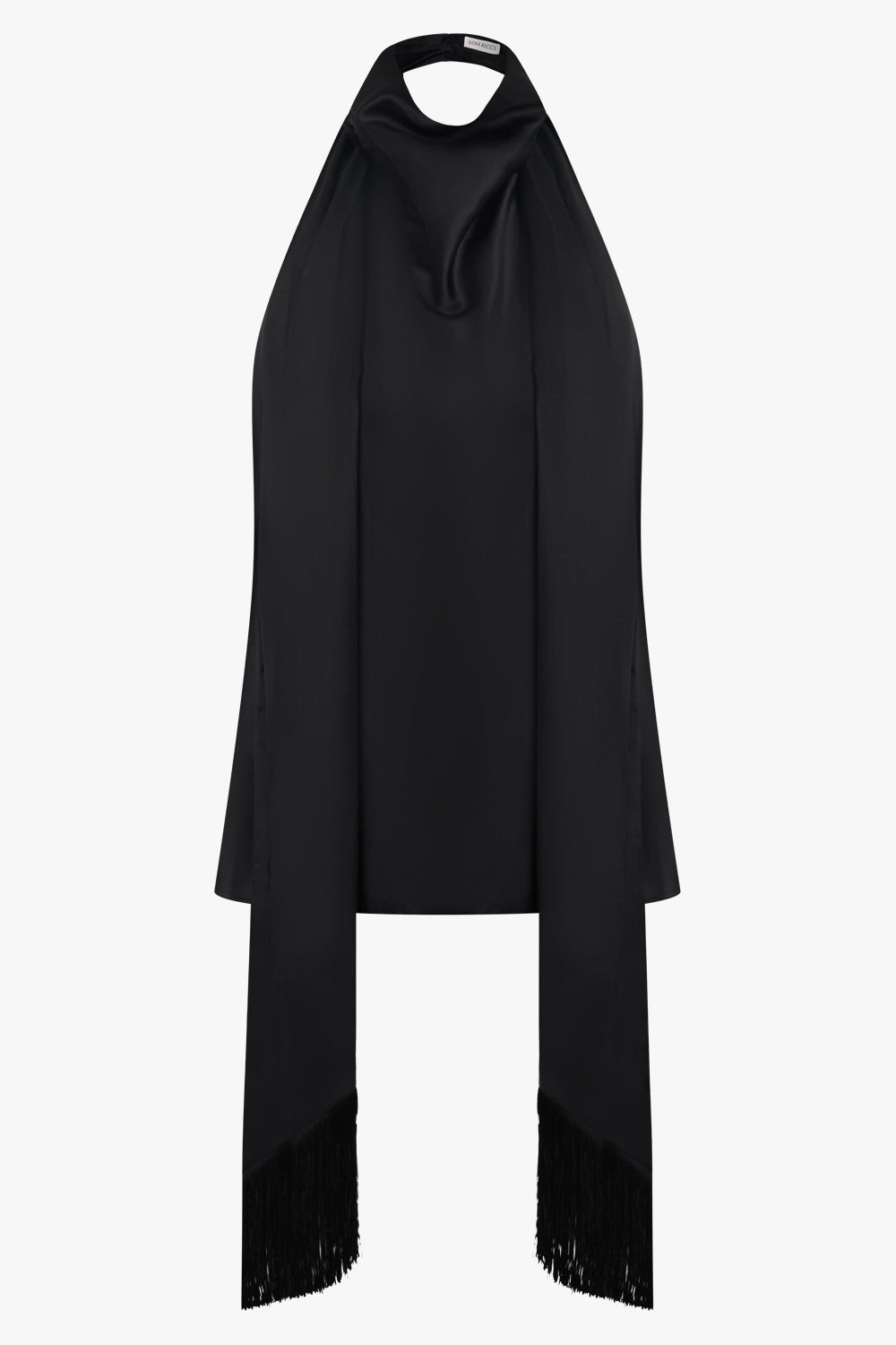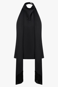 The Halterneck Top With Scarf Neck in black is crafted from a luxurious satin blend that drapes fluidly across the frame. The elegant silhouette features a removable long fringed scarf that can be styled tied at the neck or worn loose for a more dramatic statement. A clean halterneck cut reveals an open back, fastened discreetly with concealed buttons for a refined, confident finish. - Fabrication: 52% viscose, 37% silk, 11% elastane - Fluid black satin with a soft, subtle sheen - Halterneck cut with minimalist neckline - Removable long scarf with fringe detailing - Open back design with two concealed button fastenings - Regular fit for elevated day-to-night styling Style with high-waisted tailored pants or evening skirts to highlight the fluid lines and bold colour statement.
