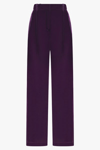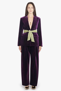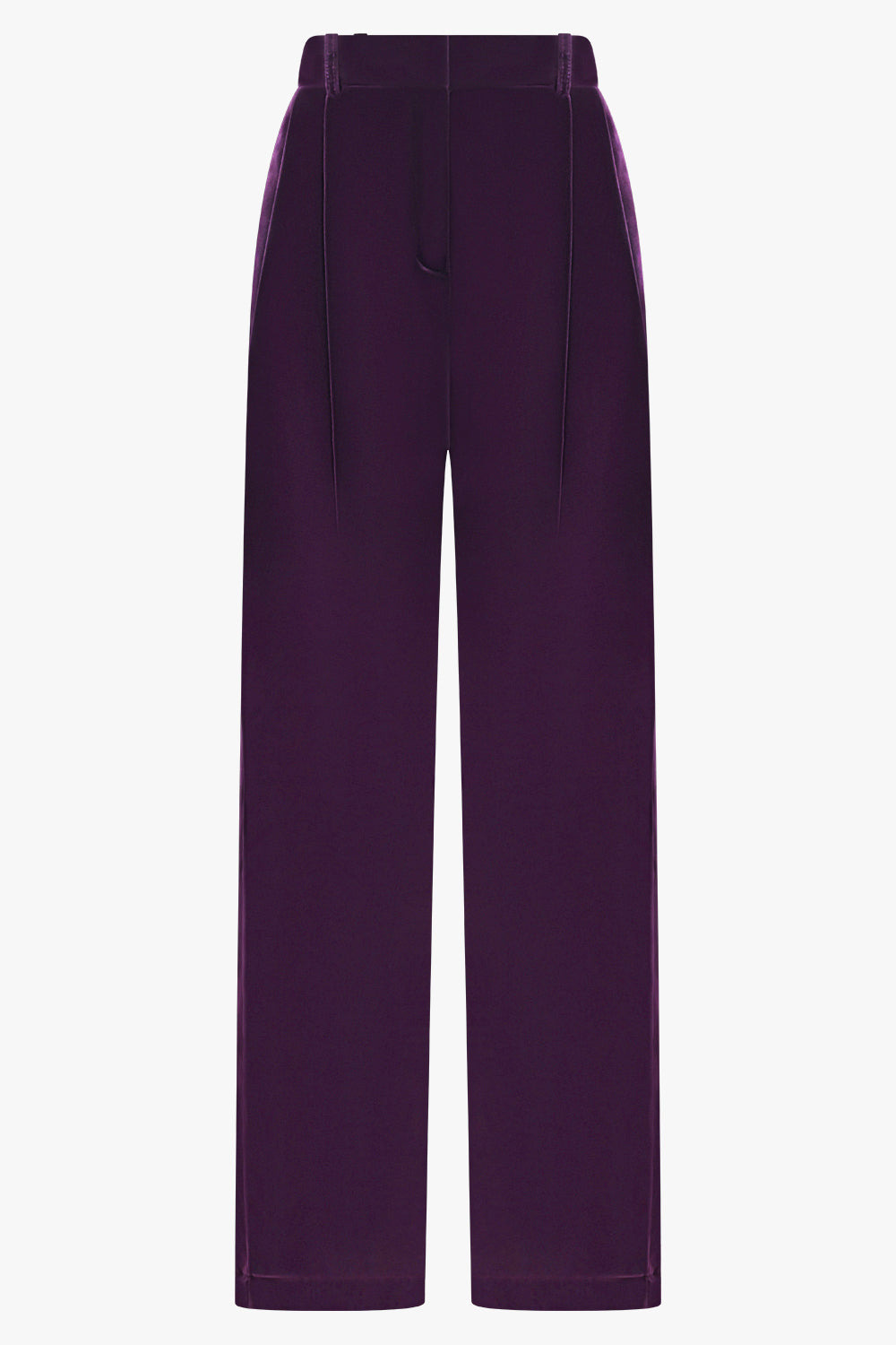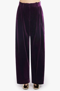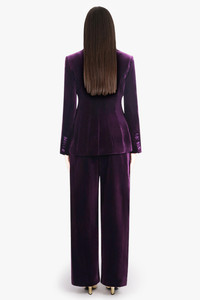 These High-Waist Tapered Pants are crafted from plush cotton velvet in a rich purple hue, delivering structure and softness in equal measure. The high-rise silhouette elongates the leg, while subtle tapering through the leg creates a sculptural shape. Finished with a classic fly front and functional pockets, these trousers offer both tailored ease and standout texture. - Fabrication: 100% cotton - Rich purple velvet with soft, structured hand feel - High-rise waist with tailored waistband - Wide leg fit - Soft pleat at front of legs - Front button and zipper fly closure - Side and back pocket detailing Style with a crisp shirt or the matching velvet blazer to highlight the silhouette’s strong lines and rich texture. Size and Fit Tiah: Model is 178cm/5’9” and is wearing a size FR38 Model Measurements: Bust: 86cm, Waist: 69cm, Hips 90.5cm Fits true to size.