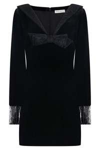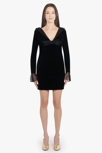 This Long-Sleeve Mini Dress is crafted from plush black cotton velvet, combining romantic detail with sleek structure. The V-shaped neckline is finished with an elegant bow, while voluminous lace bell cuffs lend textural contrast and vintage charm. A modern interpretation of classic evening wear, the silhouette flatters the form with gentle shaping and refined finish. - Fabrication: 100% cotton - Black velvet with a soft, structured hand feel - Hidden zipper and clasp for slim fit - Deep V-neckline with statement bow detail - Long sleeves with flared lace bell cuffs - Mini length hemline Style with heeled mules and an evening bag to highlight the dress’s romantic contrast of textures and bold femininity. Size and Fit Tiah: Model is 178cm/5’9” and is wearing a size FR38 Model Measurements: Bust: 86cm, Waist: 69cm, Hips 90.5cm Fits true to size.
