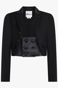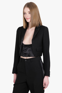 - Fabrication: w - ool 75% mohair 25%, attach: silk 50% wool 50% - Shoulder pad inserts - Cinched waist - Non-stretchy fabric - Cropped Size and Fit Sophie: Model is 179cm/5’10” and is wearing a size S Model Measurements: Bust: 76cm, Waist: 61cm, Hips 87.5cm Fits true to size Measurements S: Bust 88cm, Waist 80cm, Length 41cm M: Bust 92cm, Waist 84cm, Length 41cm L: Bust 96cm, Waist 88cm, Length 41cm