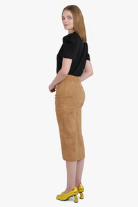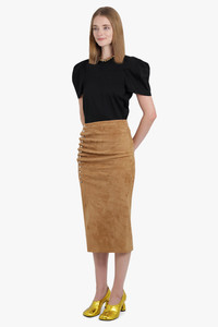 ASYMMETRIC RUCHED LEATHER MIDI SKIRT | NEW CARAMEL