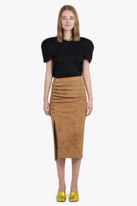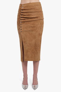 Featuring asymmetric ruching along the front and a row of silver-tone buttons, this leather midi skirt also offers an adjustable slit on one side for added versatility. Fabrication: 100% leather Size and Fit Sophie: Model is 179cm/5’10” and is wearing a size FR36 Model Measurements: Bust: 76cm, Waist: 61cm, Hips 87.5cm French sizing Fits true to size Measurements 36: Waist 74cm, Hip 78cm, Length 80cm 38: Waist 76cm, Hip 80cm, Length 80cm 40: Waist 78cm, Hip 82cm, Length 80cm