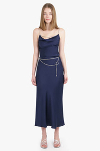 This Deep Navy maxi skirt features a silver-tone chain detail at the waist and a midi length. Fabrication: 100% recycled polyester Size and Fit Sophie: Model is 179cm/5’10” and is wearing a size FR36 Model Measurements: Bust: 76cm, Waist: 61cm, Hips 87.5cm French sizing Fits true to size Measurements 34: Waist 70cm, Hip 80cm, Length 98cm 36: Waist 72cm, Hip 82cm, Length 98cm 38: Waist 74cm, Hip 84cm, Length 98cm