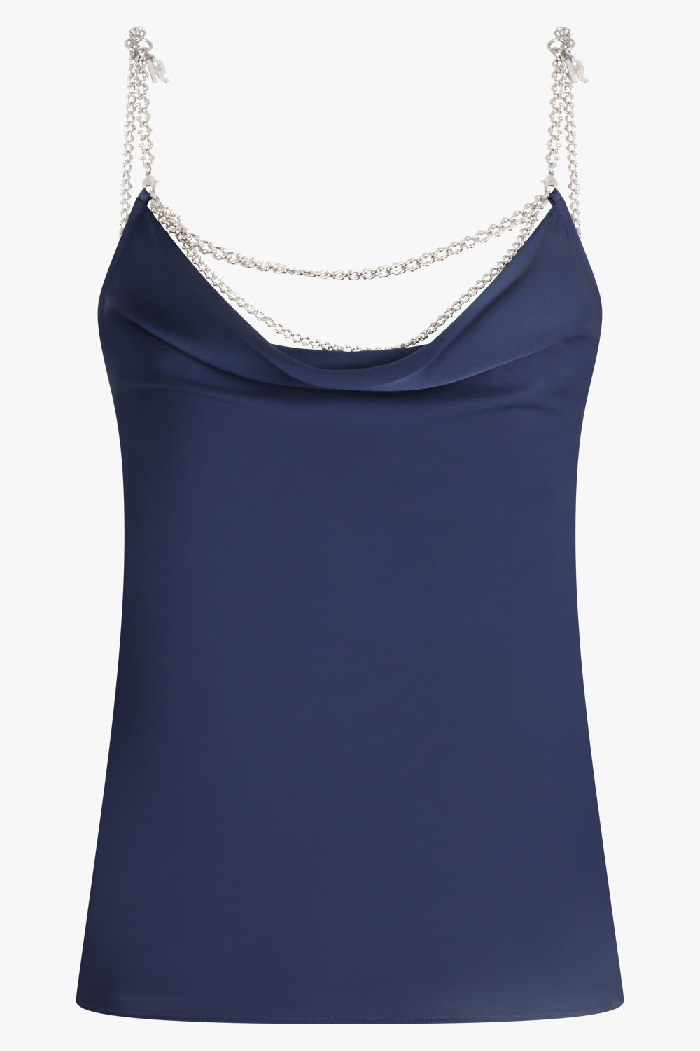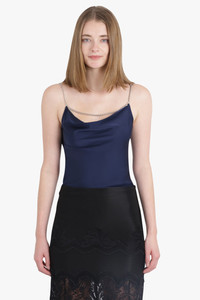 This Camisole Top features a Deep Navy colour and is designed with a draped cowl neckline and silver-tone chain straps. Fabrication: 100% recycled polyester in double satin Size and Fit Sophie: Model is 179cm/5’10” and is wearing a size FR36 Model Measurements: Bust: 76cm, Waist: 61cm, Hips 87.5cm French sizing Fits true to size Measurements 34: Bust 76cm, Waist 76cm, Hip 76cm, Length 65cm 36: Bust 78cm, Waist 78cm, Hip 78cm, Length 65cm 38: Bust 80cm, Waist 80cm, Hip 80cm, Length 65cm