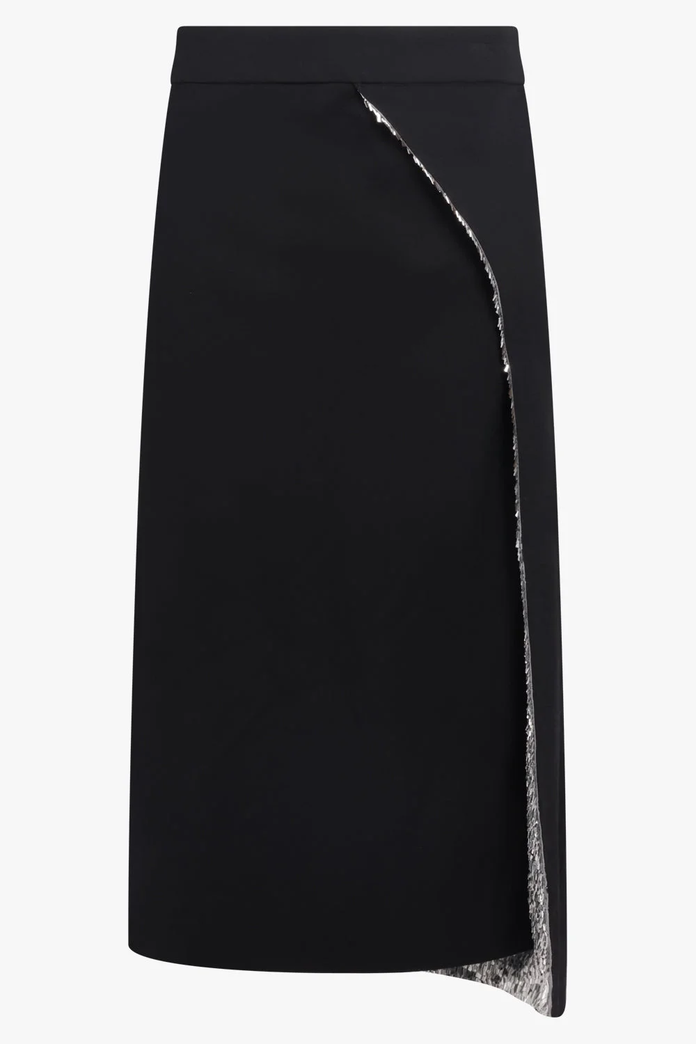 The Contrast Zip Asymmetric Panel Skirt balances refined tailoring with dynamic detailing to offer a modern evening silhouette. The high-waisted cut and sleek black body are offset by a striking side-zip closure and asymmetric panel that creates movement and visual intrigue. The clean waistband gives structure while the exposed zip and diagonal panel bring an edge of metallic shine and architectural form. - Fabrication: 100% Polyester - Black base fabric with contrasting side-zip detail and asymmetric panel - High-fitted waistband - Diagonal panel creating asymmetric hemline - Smooth black fabric for structure, contrast panel and zip for statement detailing Style with the matching top and minimalist silver accessories for a cohesive, high-impact set in eveningwear. Size and Fit Tiah: Model is 178cm/5’9” and is wearing a size FR38 Model Measurements: Bust: 86cm, Waist: 69cm, Hips 90.5cm Fits true to size