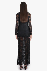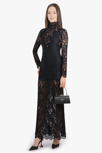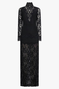 The Long Lace & Jersey Dress features a refined stand collar and a fluid ankle-length silhouette. Crafted from delicate lace contrasted with soft viscose jersey, it offers both coverage and subtle sheerness. Long fitted sleeves and scalloped edges bring a romantic, feminine finish, while the interplay of textures creates an elegant yet modern aesthetic. - Fabrication: 90% polyamide, 10% elastane - Long fitted sleeves with sheer lace finish - High stand collar for a refined neckline - Ankle-length skirt - Scalloped edges at hem and cuffs - Delicate lace with stretch viscose jersey for comfort and structure Style with Rabanne jewellery and bags evening occasions.