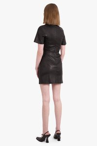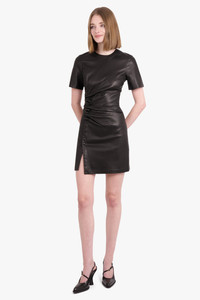 LEATHER S/S ASYMMETRIC RUCHED MINI DRESS | BLACK