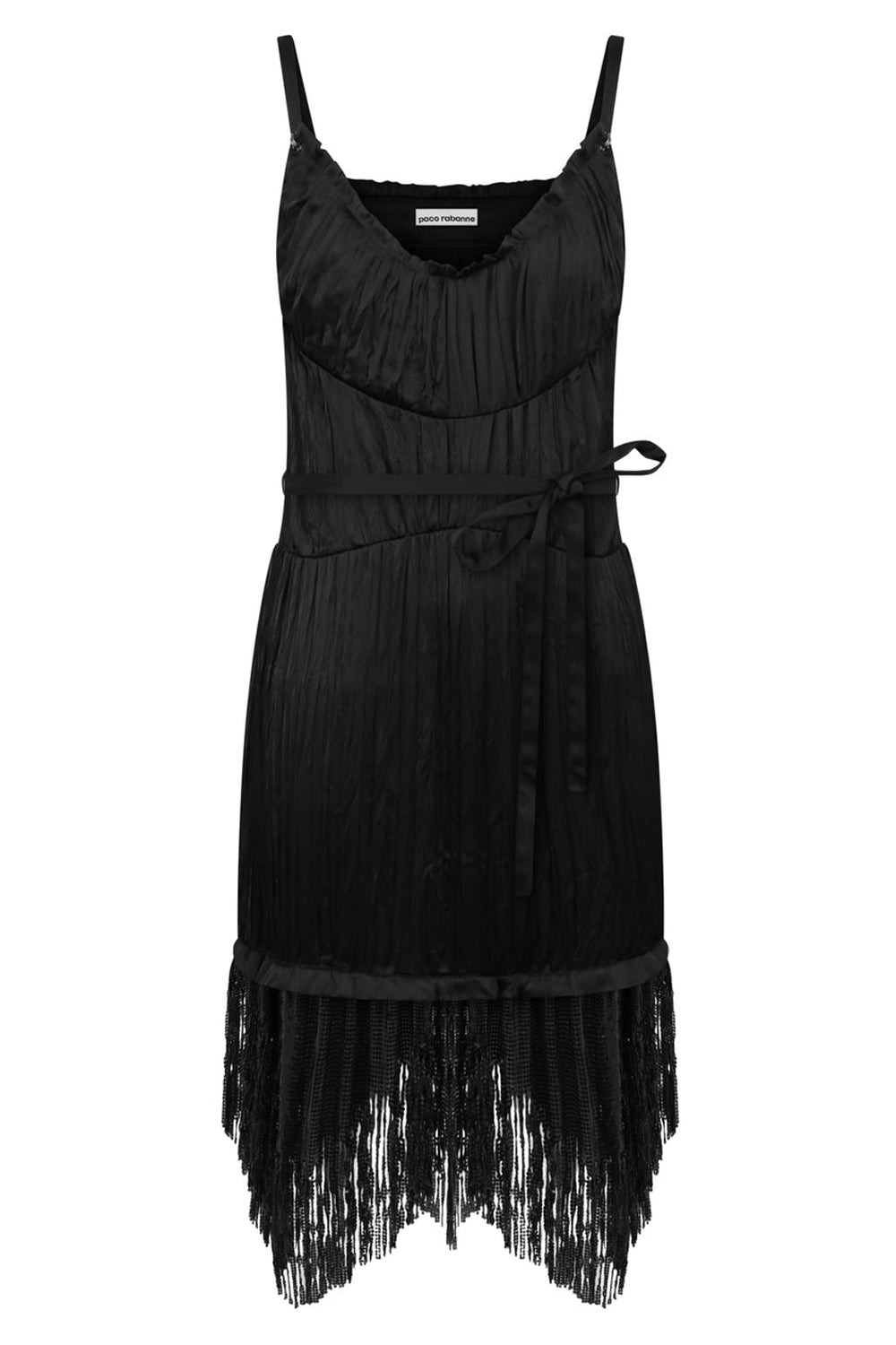 The Rabanne Ruched Strapy Dress in Black is a perfect example of the house's ability to blend modern sensibilities with their iconic metal detailing. This style features a mini length, ruching along the body, flattering darts throughout, slim straps and tie waist with side zip. Fabrication: 100% Polyester, 100% Aluminium. Made in France Size and Fit Lacey: Model is 180cm/5’11” and is wearing a size FR36 Model Measurements: Bust: 86cm, Waist: 72cm, Hips 89cm French sizing This style fits true to size.