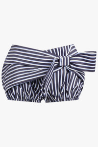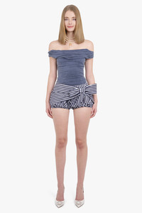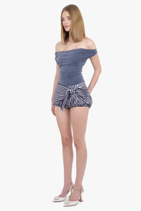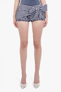 Elevate your summer wardrobe with Rabanne's Tie Front Stripe Bloomer Short in Blue/White. This sleek and stylish mini-length short features elegant pin stripes and a delicate side bow accent. Designed with a cheeky fit and elasticated legs for comfort, it also boasts a hidden zipper closure for a seamless finish. Embrace luxury and sophistication in these must-have shorts. Fabrication: 100% Cotton Size and Fit Sophie: Model is 179cm/5’10” and is wearing a size FR36 Model Measurements: Bust: 76cm, Waist: 61cm, Hips 87.5cm French sizing Fits true to size, cheeky fit Measurements 36: Waist 72cm, Hip 90cm, Length 26cm 38: Waist 76cm, Hip 94cm, Length 26cm